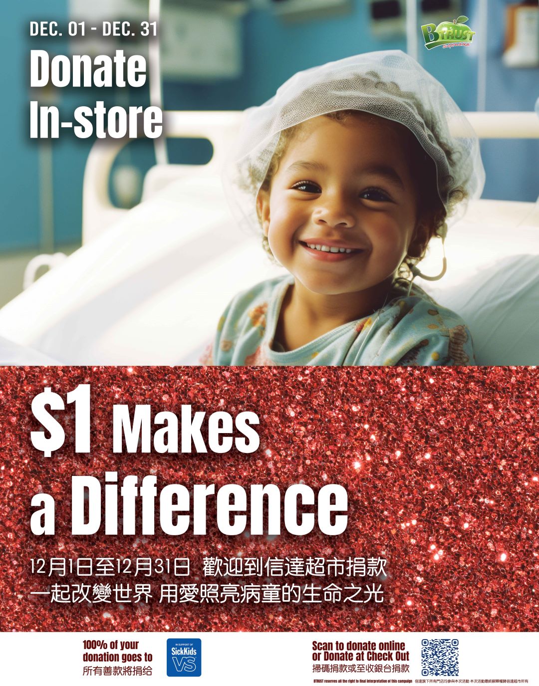 In December 2023, BTrust Supermarket launched the Month of Chairty across its three stores, aiming to raise funds for the SickKids Hospital.